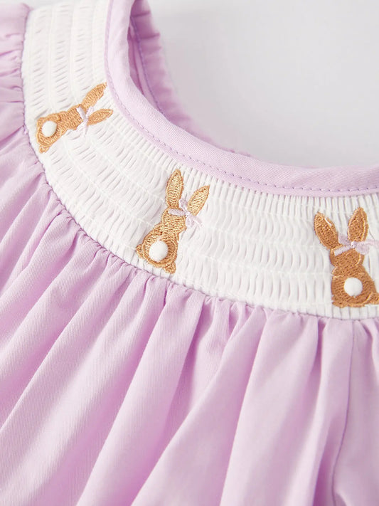 Girls Easter Bunny Smocking Embroidered Lace Cuff Purple Dress